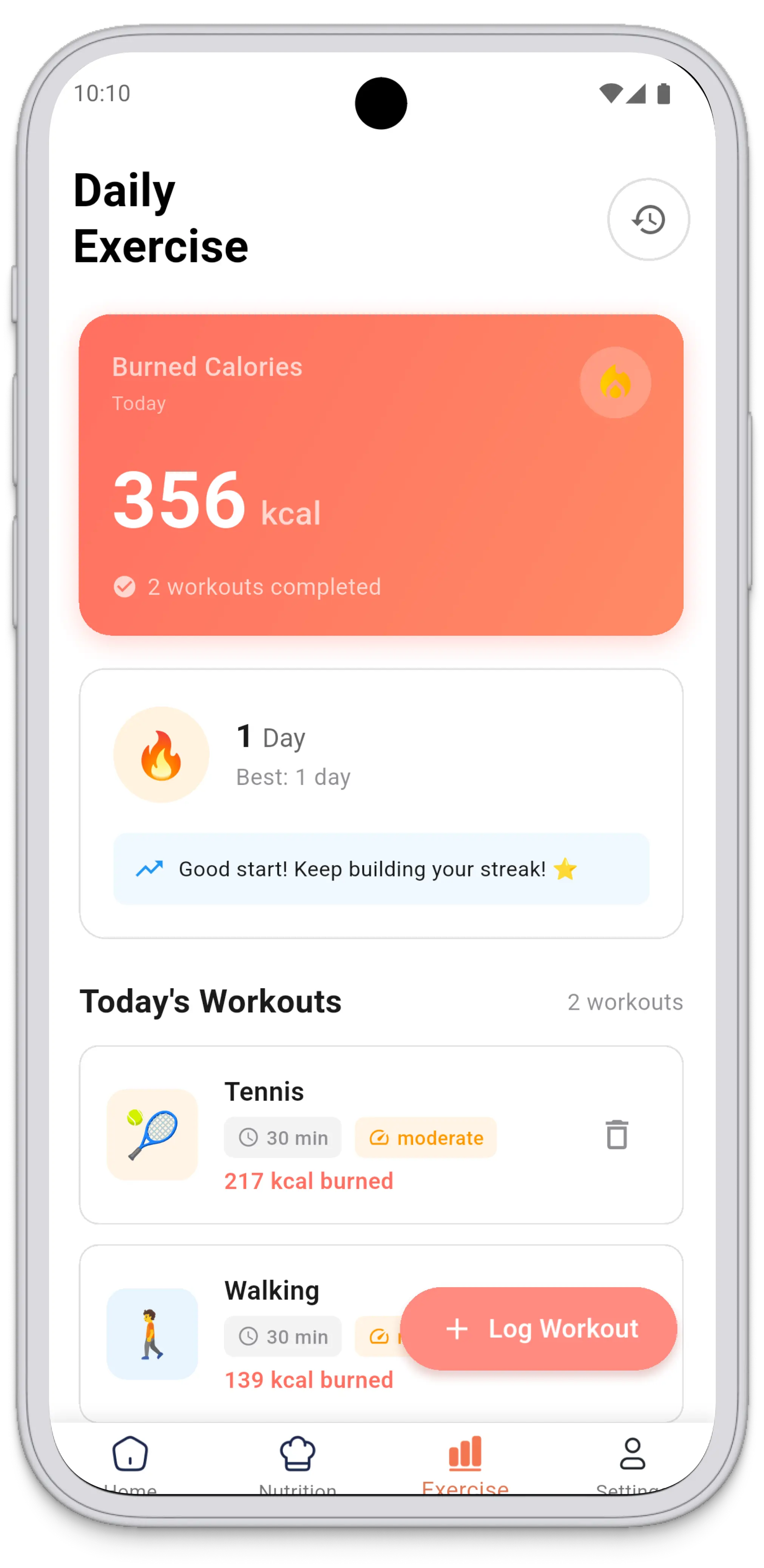 No internet required. Track your nutrition anytime, anywhere. Your data is always available on your device and stays completely private.