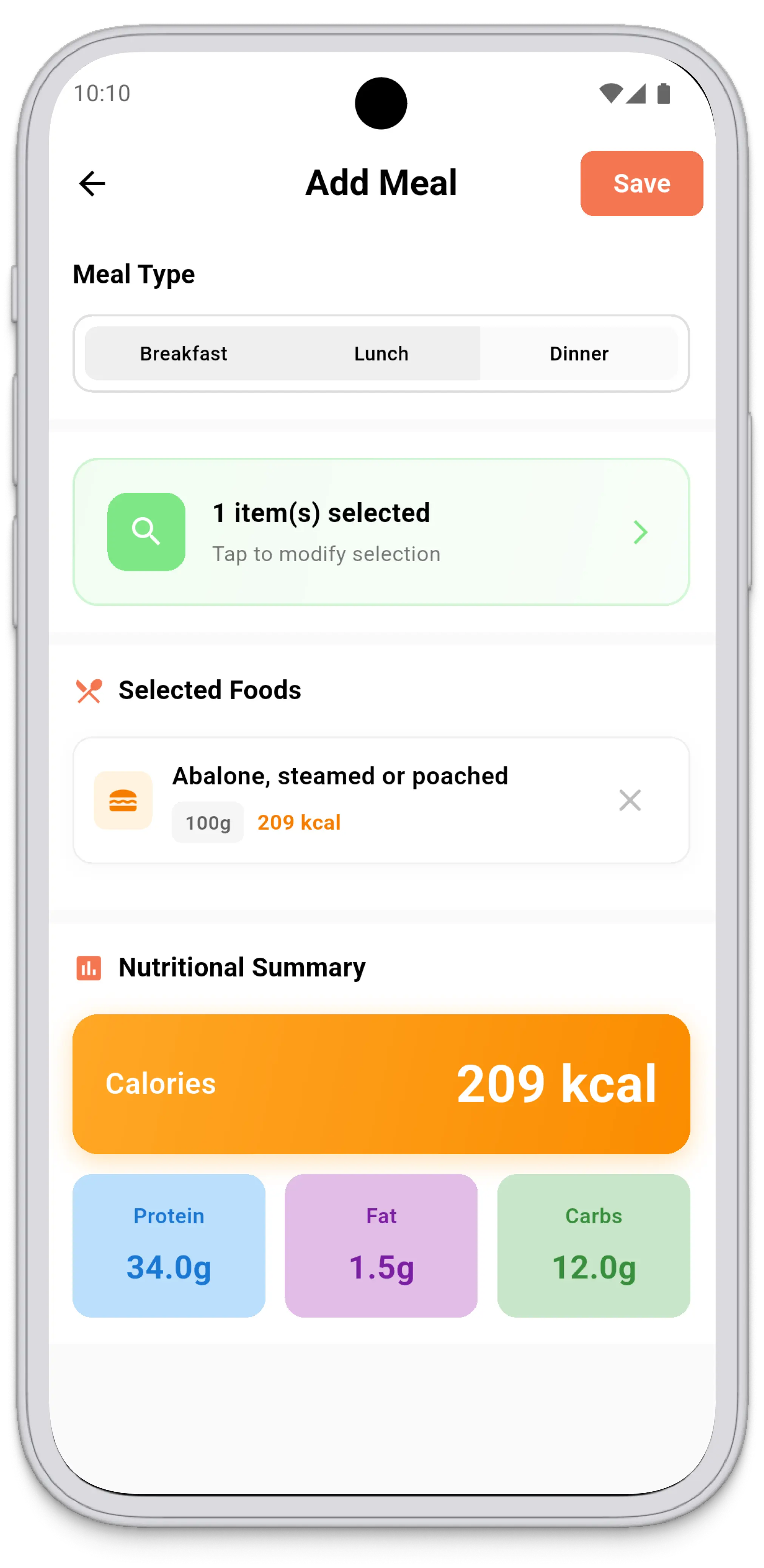 Monitor your daily calorie intake with clear, easy-to-understand totals. Track protein, fat, and carbohydrates effortlessly with detailed nutrition information.